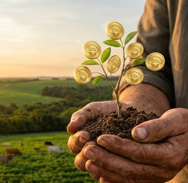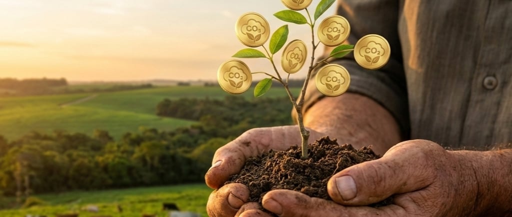 O Crédito de Carbono é um "vale" ou certificado que prova que você tirou ou evitou que uma tonelada de gás carbônico (o gás que polui) fosse para o ar. Você ganha esse vale quando faz coisas boas na fazenda, como plantar mais árvores, cuidar da floresta (REDD+) ou usar técnicas que melhoram a terra (como o Plantio Direto).
